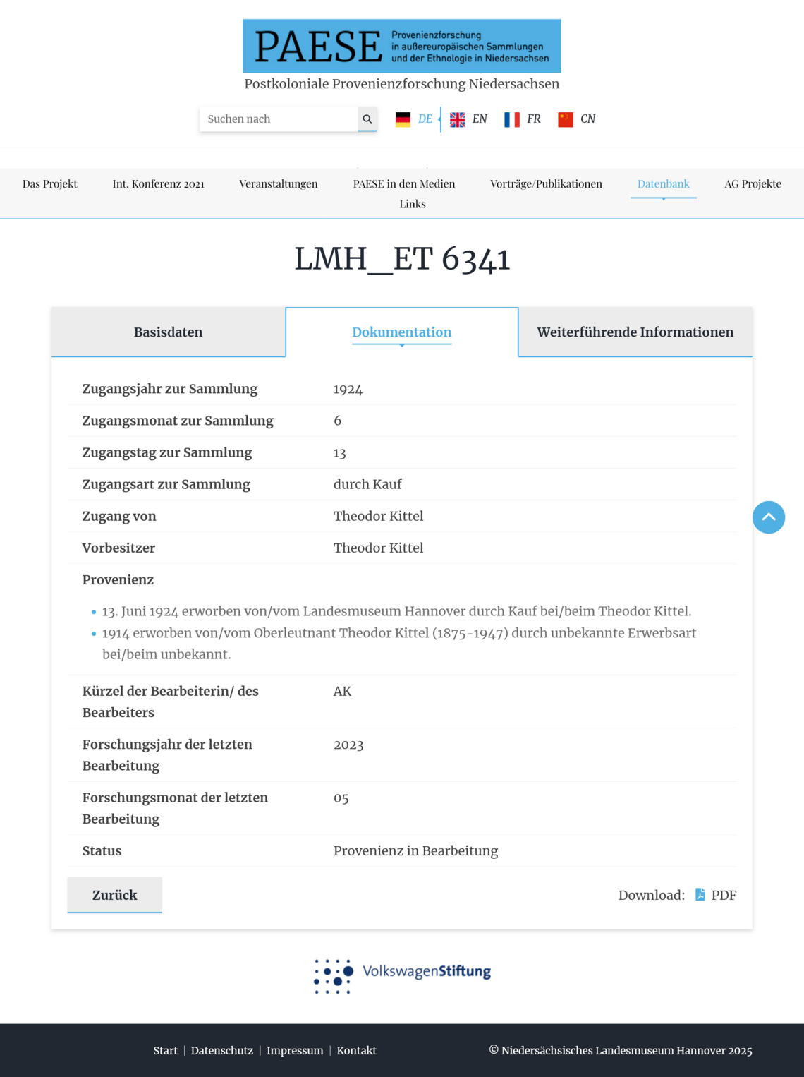 Die PAESE Datenbank präsentiert derzeit in hybrider Form Objektdaten und Freitexte als Ergebnis einer sich seit Anfang der 2000 Jahre konstituierenden systematischen und institutionalisierten postkolonialen Provenienzforschung, die nicht nur nach dem kolonialen (gewalthaften) Kontext von Sammlungen fragt, sondern auch eine proaktive systematische Klärung ihres Status und seiner Bedeutung im Kontext transnationaler Debatten um indigenous cultural heritage, cultural property, Rückgabe und shared heritage einfordert (Förster, Eidenheiser, Fründt, Hartmann, 2018). Diese Ergebnisse beinhalten unsichere Daten und Wissenslücken, die auf respektive koloniale Kontexte als konstituierende Faktoren von (Nicht)Wissen verweisen.